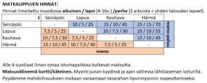 Lippuja myydään junassa sekä mahdollisuuksien mukaan laiturilla ennen junan lähtöaikaa. Maksu tapahtuu kortilla, myös käteinen hyväksytään. Paikkavarauksia ei ole, joten suosittelemme saapumaan asemalle hyvissä ajoin.
